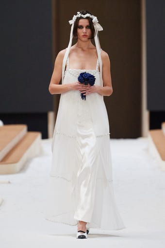 Evening dresses are adorned with feathers, exceptional embroidery, romantic ruffles and all-transparency details that invite celebration and contrast. The bride, the traditional last passage of the haute couture show, unveils a long white dress with straps and discreet lace inserts. In her hands, a bouquet of blue flowers.